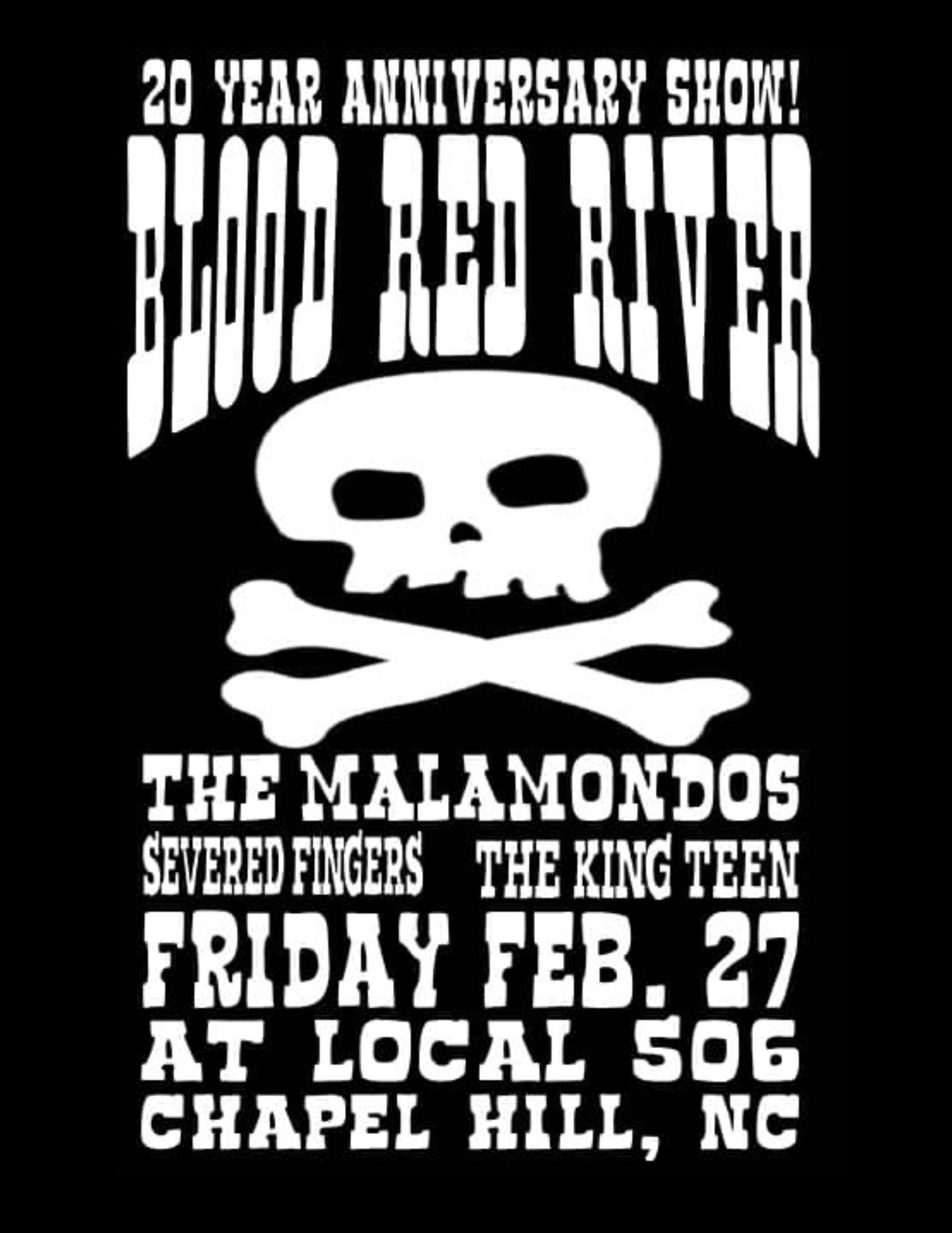 Blood Red River are celebrating their 20th birthday, same date and same venue where they played their first gig. If you like The Cramps and The Mekons and Dick Dale and bands that put on a good show you'll like them. You'll also like The Malamondos, who are like BRR's evil twin from Greensboro, and Severed Fingers, who come at a similar vibe from more of a country angle. It's gonna be a good show.